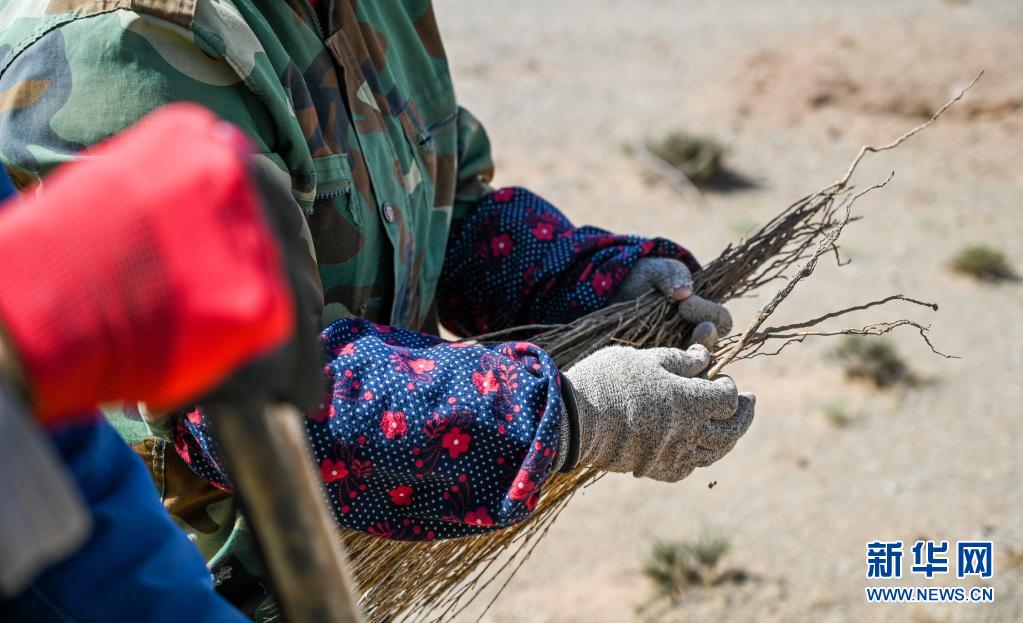 随着气温回升,在内蒙古自治区阿拉善盟的戈壁深处,工人开始种植梭梭,防治荒漠化。据了解,阿拉善左旗今年已完成造林面积30.6万亩,主要种植梭梭、花棒等植物。