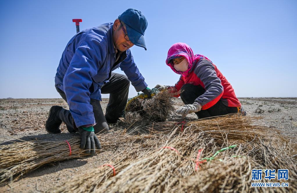 随着气温回升,在内蒙古自治区阿拉善盟的戈壁深处,工人开始种植梭梭,防治荒漠化。据了解,阿拉善左旗今年已完成造林面积30.6万亩,主要种植梭梭、花棒等植物。