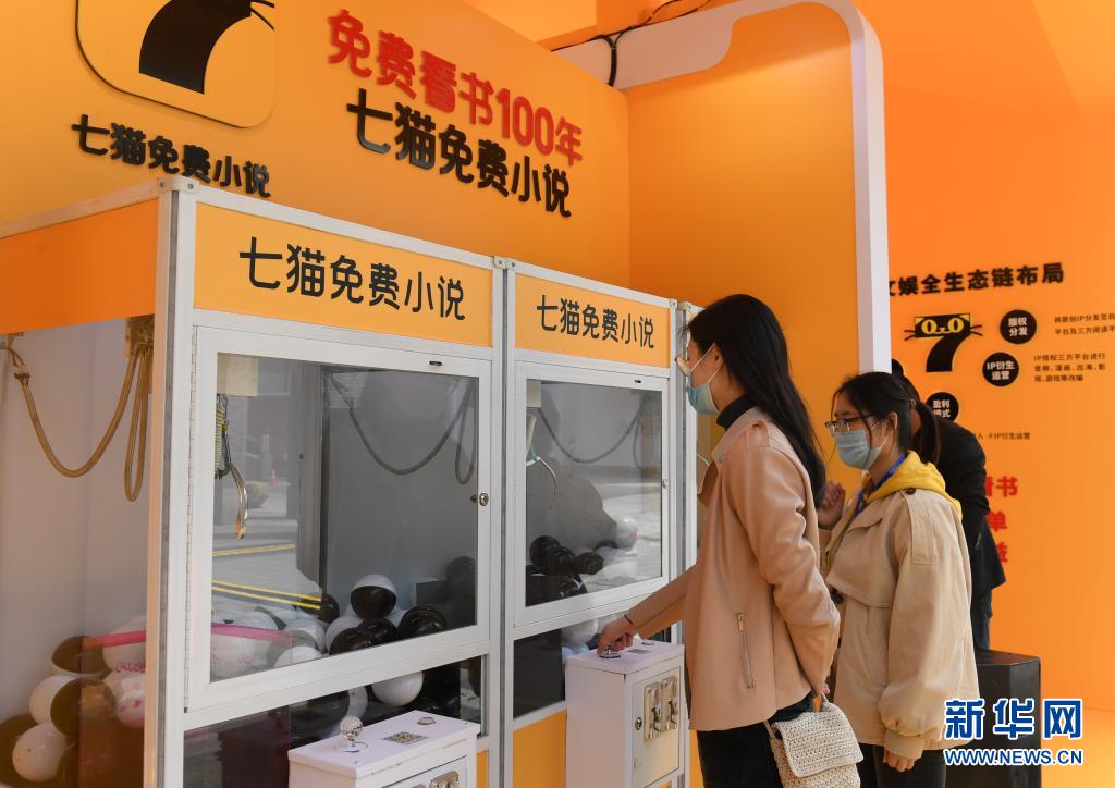 4月16日,参观者在一家数字阅读平台的展台体验游戏,抓取阅读福利。