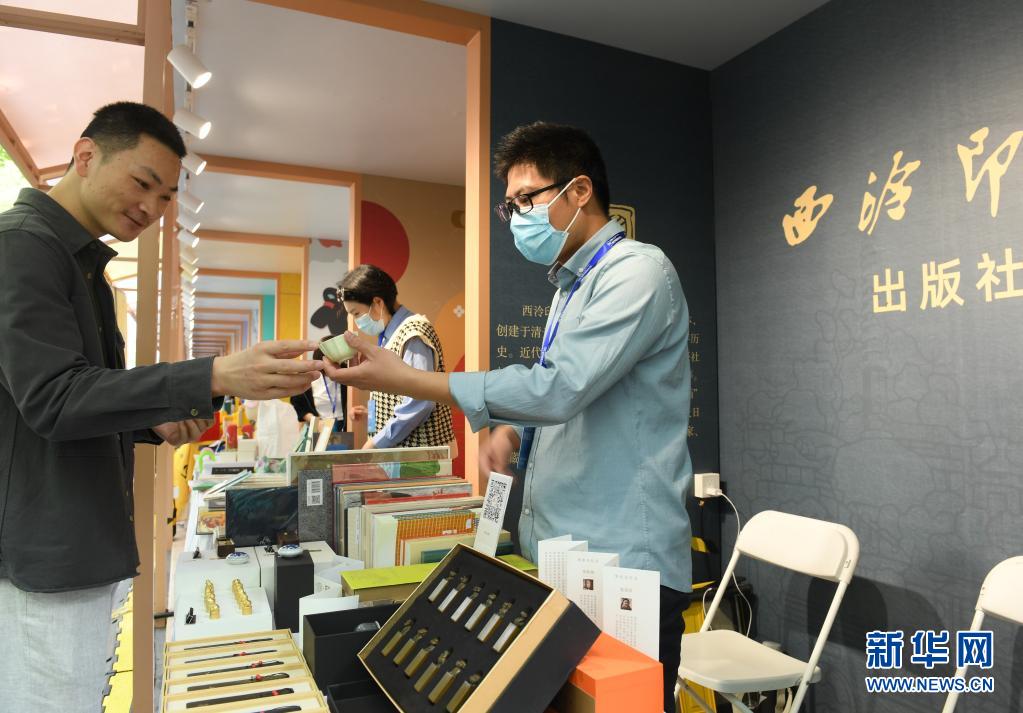4月16日,参观者在文化创意展上了解西泠印社推出的文创产品。