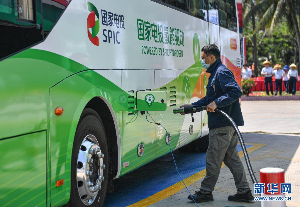 4月16日,工作人员在中国石化琼海银丰撬装加氢站准备为服务于博鳌亚洲论坛2021年年会的氢燃料电池客车加注氢气。