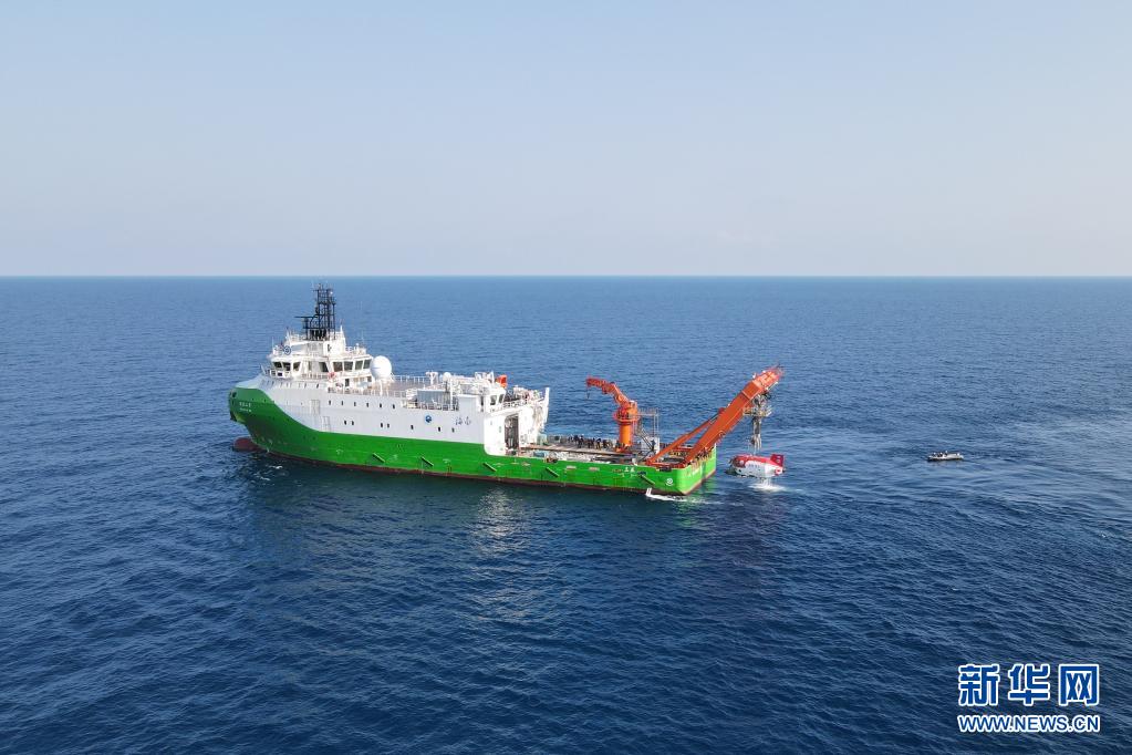 这是载人潜水器“深海勇士”号准备回到“探索二号”母船上(无人机照片)。