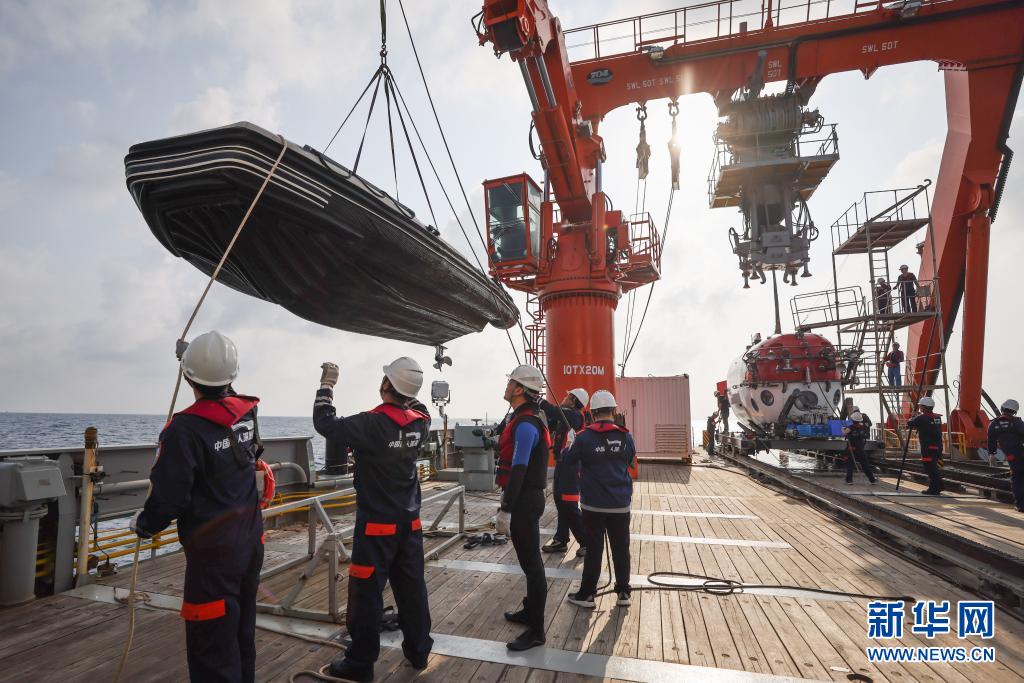 这是载人潜水器“深海勇士”号和小艇回到“探索二号”母船上。