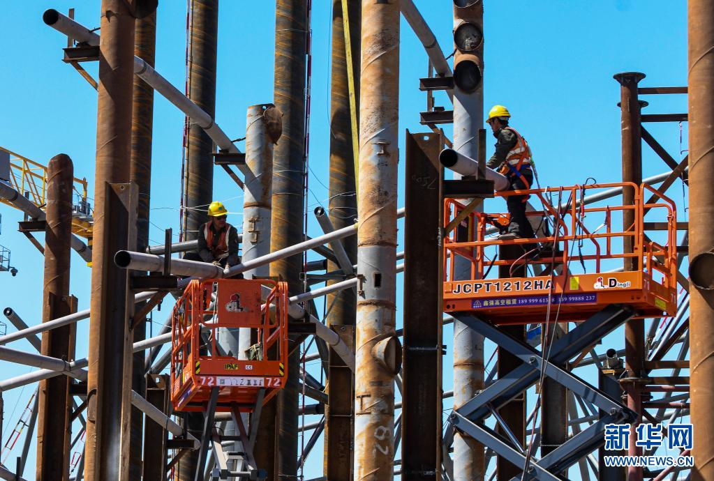 4月16日,在劳动技能竞赛现场,来自中建三局的两名施工人员参加焊接技能比武。