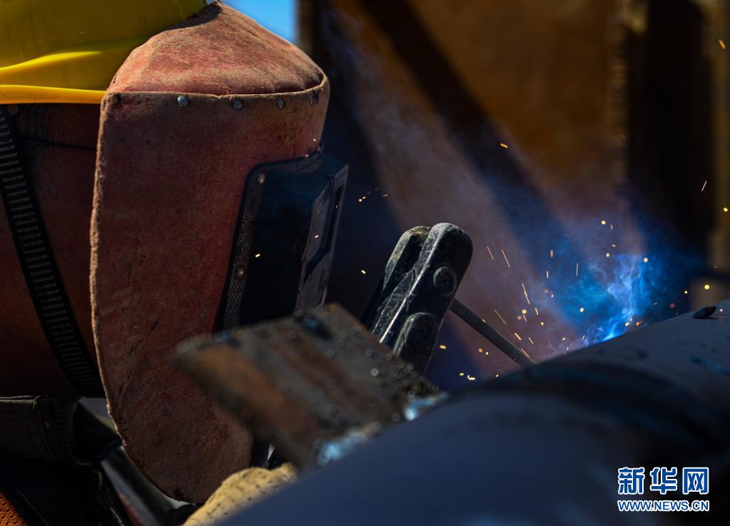 4月16日,在劳动技能竞赛现场,来自中建三局的施工人员罗磊参加焊接技能比武。