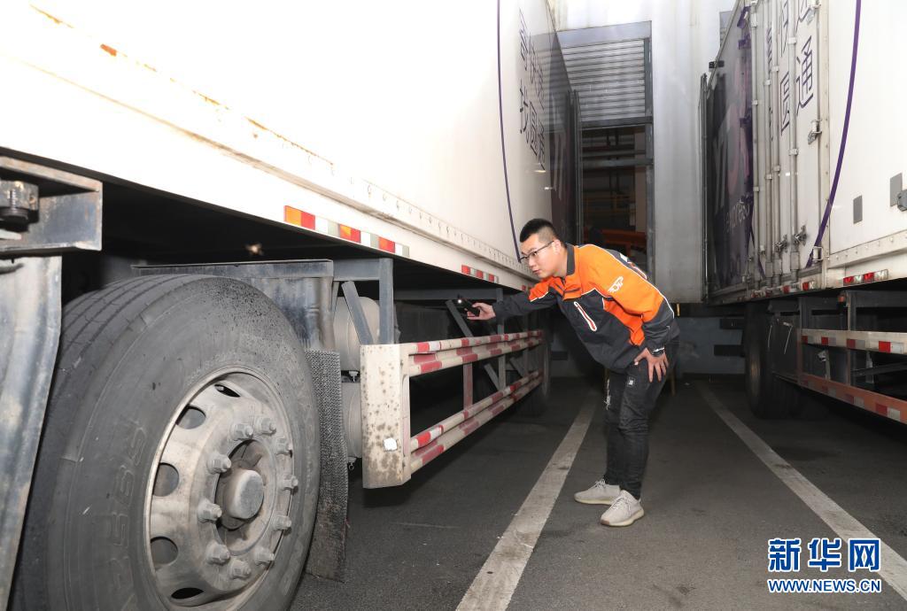 4月15日,卡车司机丁国健在出发前检查车辆外部设施和轮胎情况。