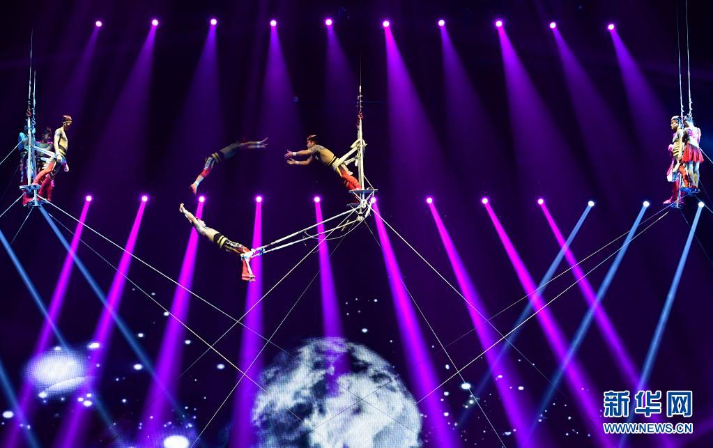 演员在河南濮阳表演杂技剧《水秀》(2017年9月5日摄)。新华社记者 冯大鹏 摄