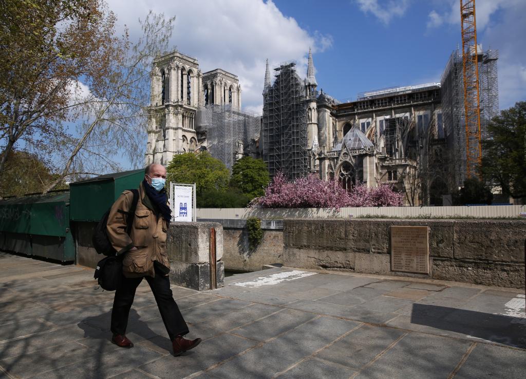 4月16日,一名男子走过修复中的法国巴黎圣母院。