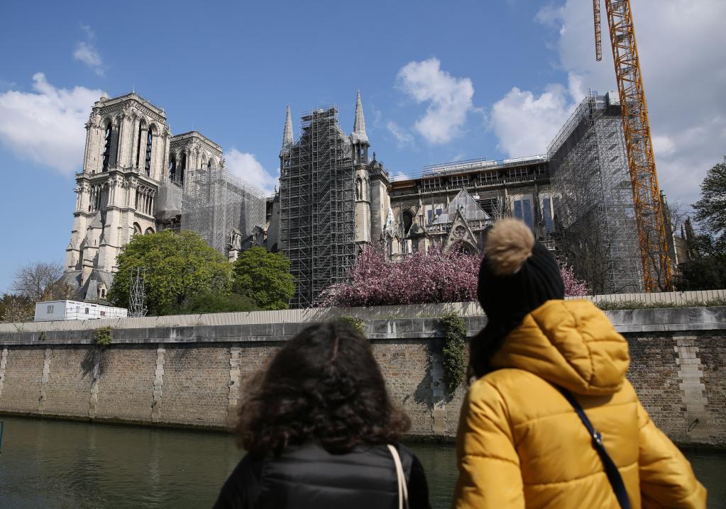 4月16日,人们望着修复中的法国巴黎圣母院。