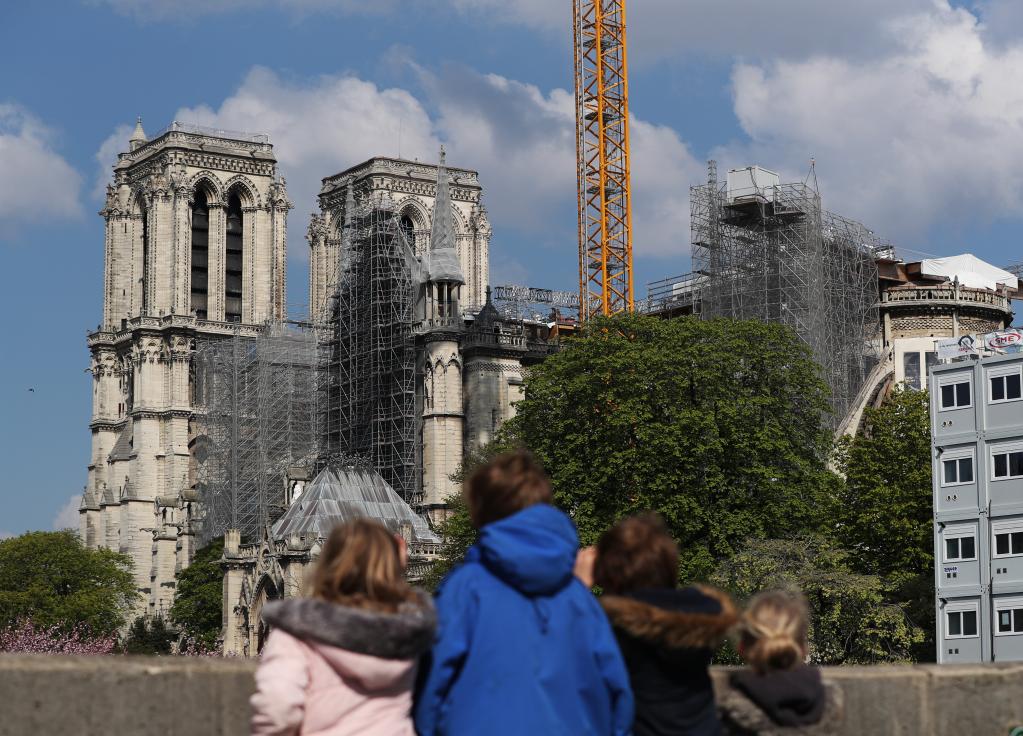 4月16日,孩子们望着修复中的法国巴黎圣母院。
