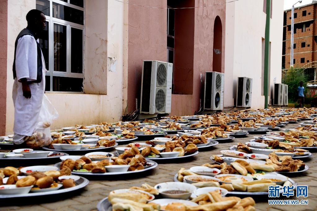 4月15日斋月期间,苏丹首都喀土穆一条街道摆满了开斋饭。