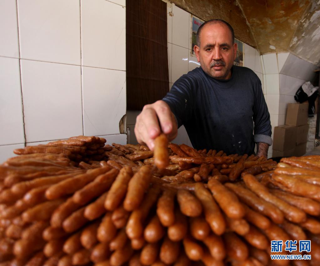 4月15日斋月期间,一名巴勒斯坦商贩在约旦河西岸城市纳布卢斯的一家市场制作甜食。
