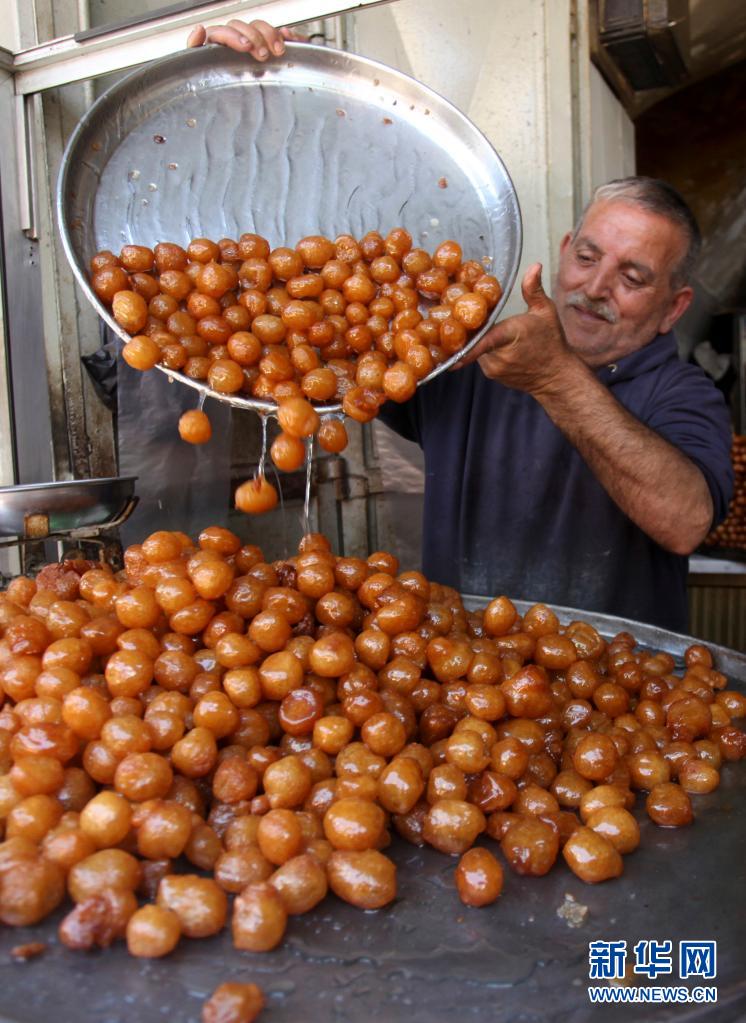 4月15日斋月期间,一名巴勒斯坦商贩在约旦河西岸城市纳布卢斯的一家市场制作传统甜食。