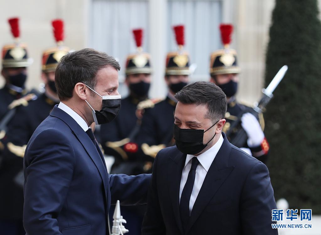 法国总统马克龙16日在巴黎总统府爱丽舍宫会见到访的乌克兰总统泽连斯基,就乌克兰东部局势等问题展开会谈。
