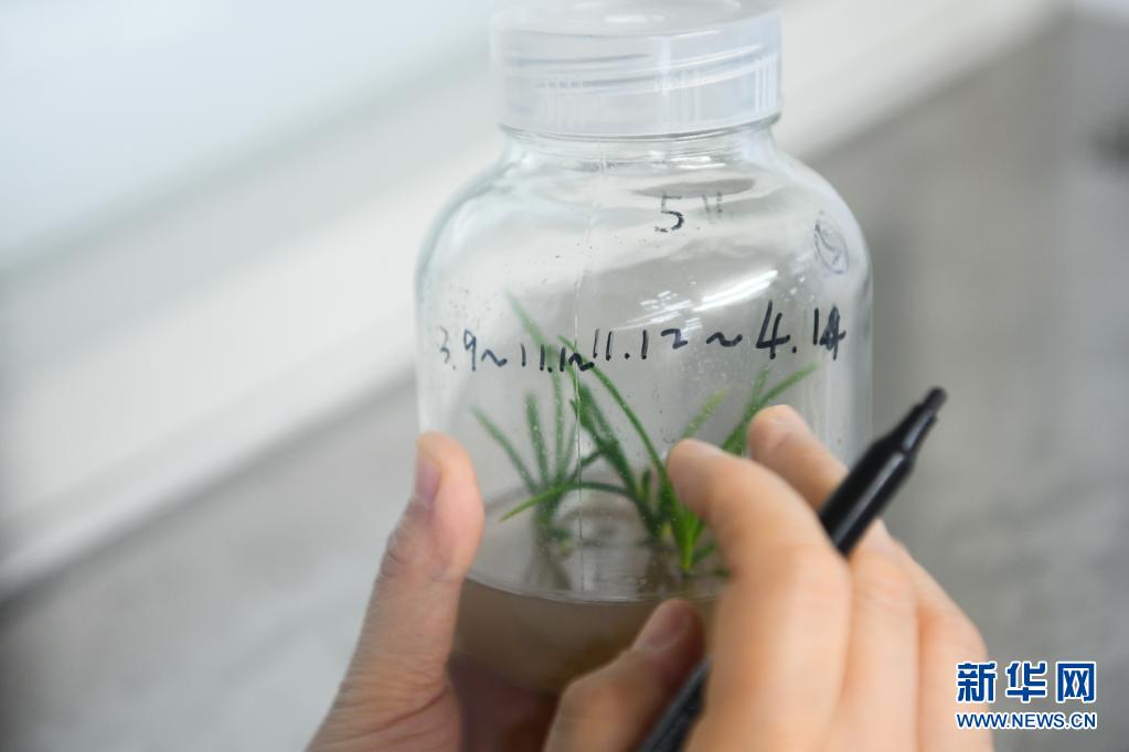 在乐山市峨眉山生物资源实验站,谷海燕在培养瓶上标注日期(4月14日摄)。新华社记者 唐文豪 摄