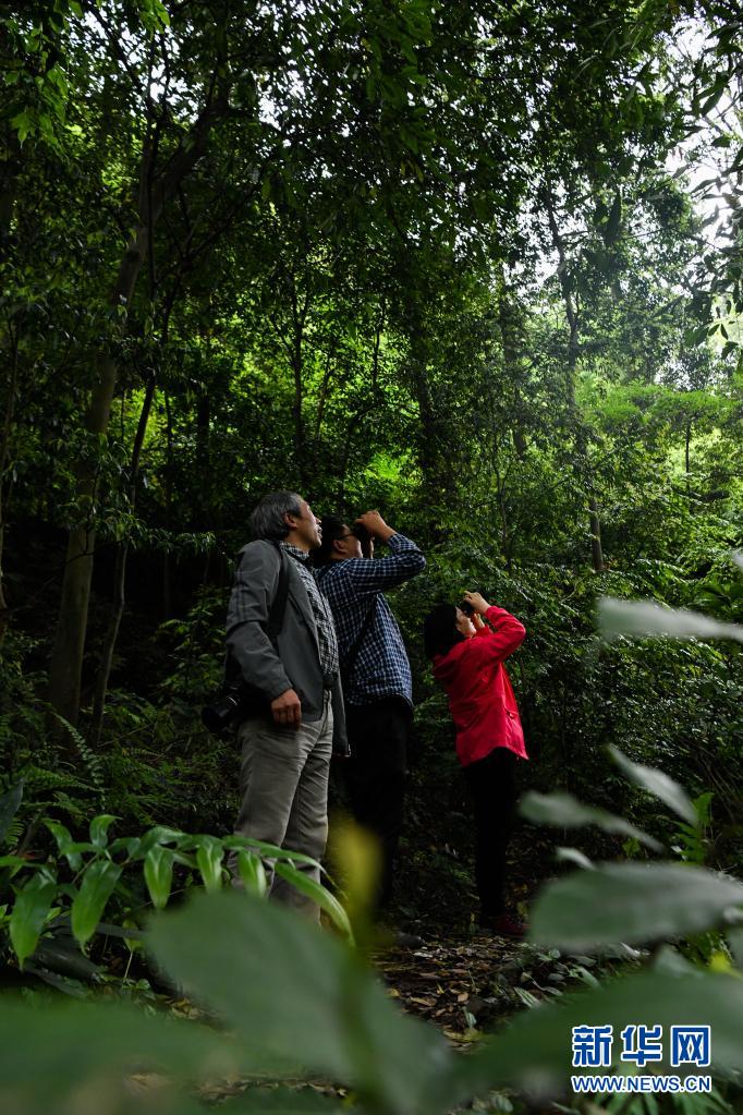 在乐山市峨眉山,科研人员谷海燕、谢孔平、李策宏(从右至左)在观察野生峨眉槽舌兰(4月13日摄)。新华社记者 唐文豪 摄