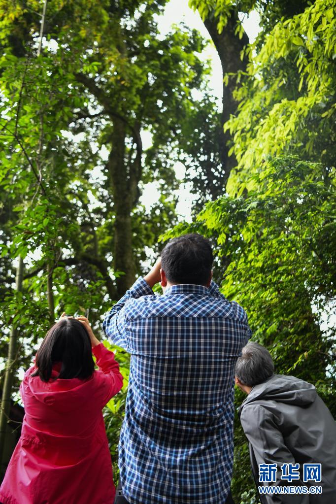 在乐山市峨眉山,科研人员谷海燕、谢孔平、李策宏(从左至右)在观察野生峨眉槽舌兰(4月13日摄)。新华社记者 唐文豪 摄