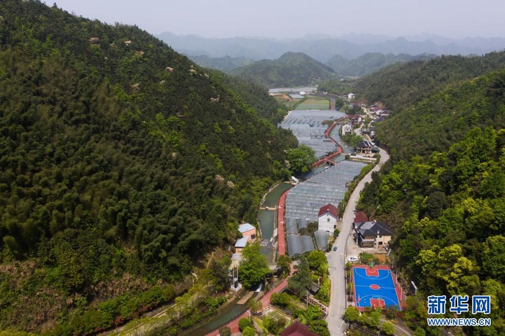4月17日,空中俯瞰山谷间的百江镇双坞村千亩樱桃基地(无人机照片)。