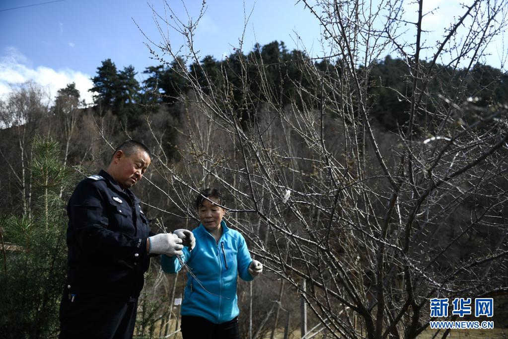 4月15日,在寺沟景区警务室旁边的空地上,赵延寿与妻子田玉秀在修剪果树。新华社记者 张龙 摄