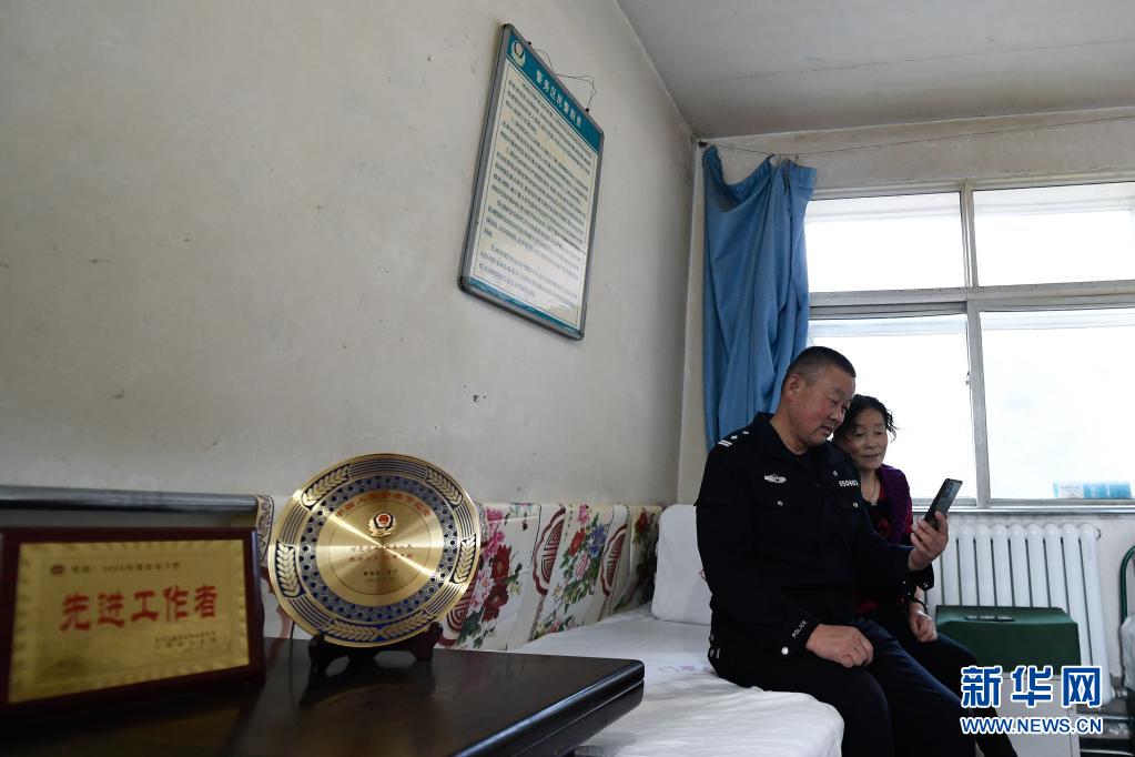 4月15日,在寺沟景区警务室,赵延寿与妻子田玉秀与儿子视频聊天。新华社记者 张龙 摄