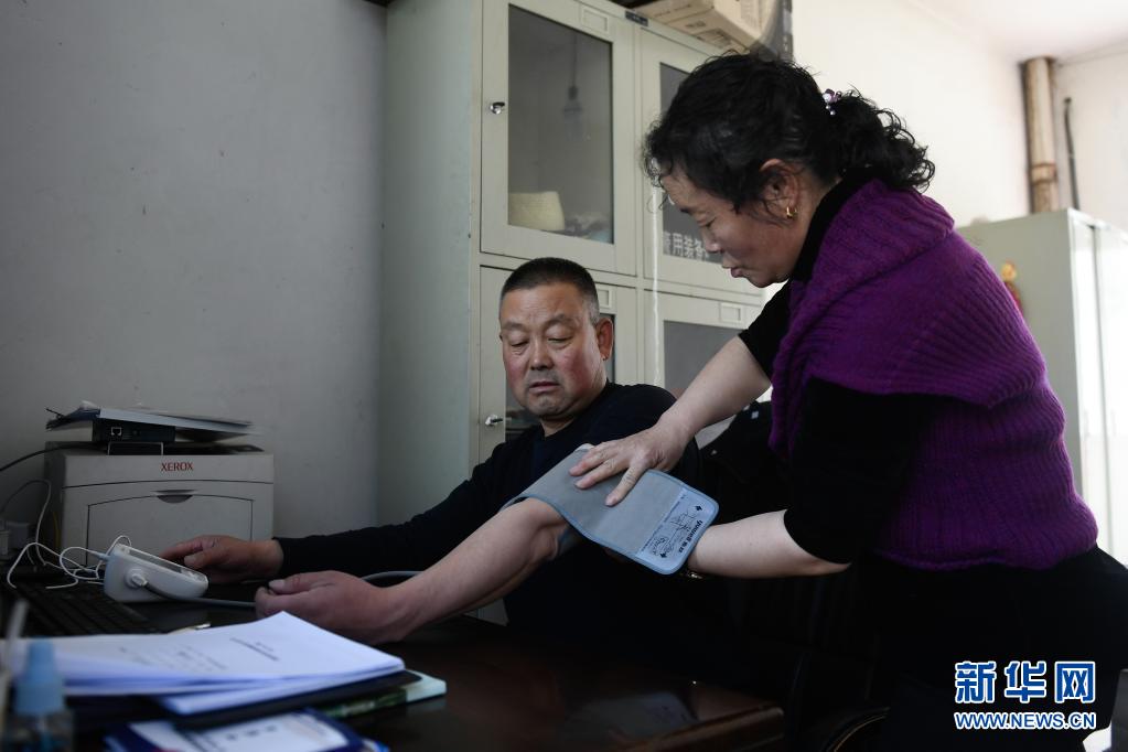 4月16日,在寺沟景区警务室,赵延寿在妻子田玉秀帮助下量血压。新华社记者 张龙 摄