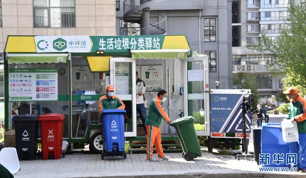 4月17日,工作人员在金隅丽港城社区的生活垃圾分类驿站进行垃圾分类运送。