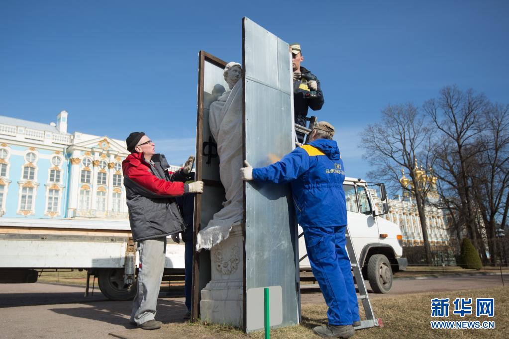 4月16日,工作人员在俄罗斯圣彼得堡叶卡捷琳娜宫花园拆卸雕塑上的封板。