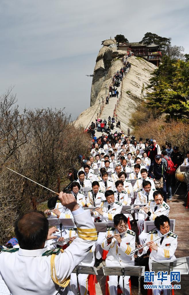 4月17日,铜管交响乐团在华山之巅演奏《没有共产党就没有新中国》。
