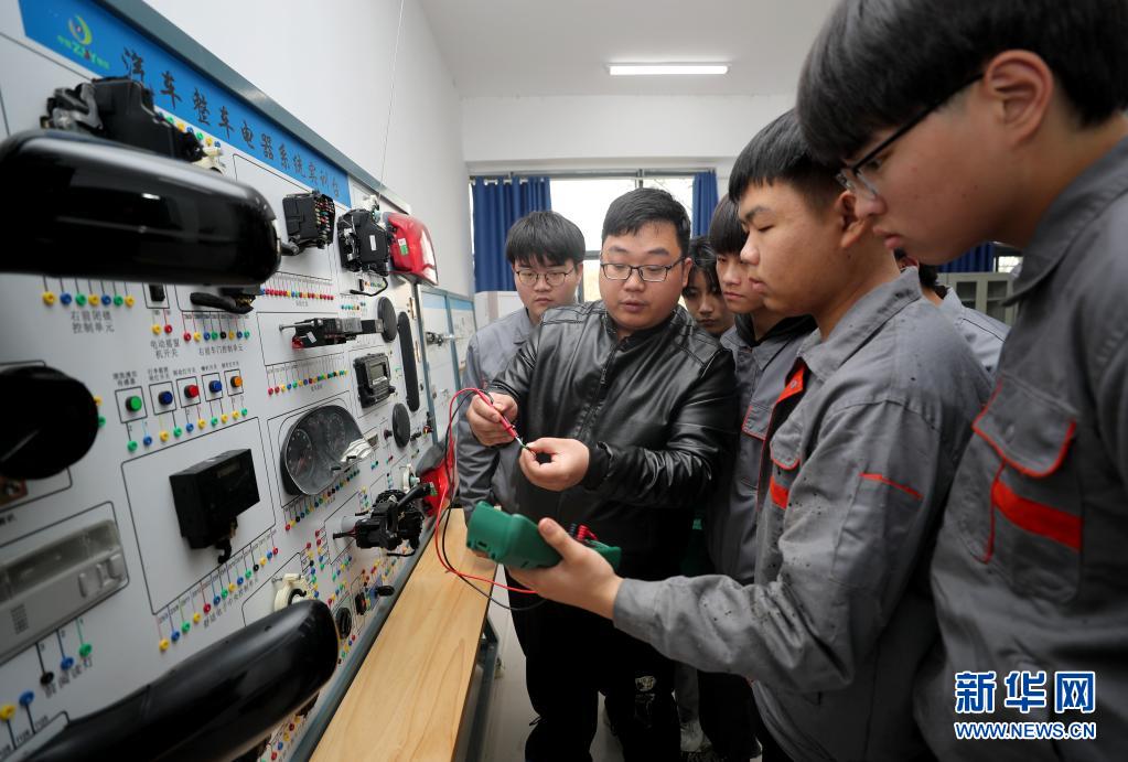 4月16日,在滁州市应用技术学校,学生们在汽车整车电器系统实训台上进行实践训练。