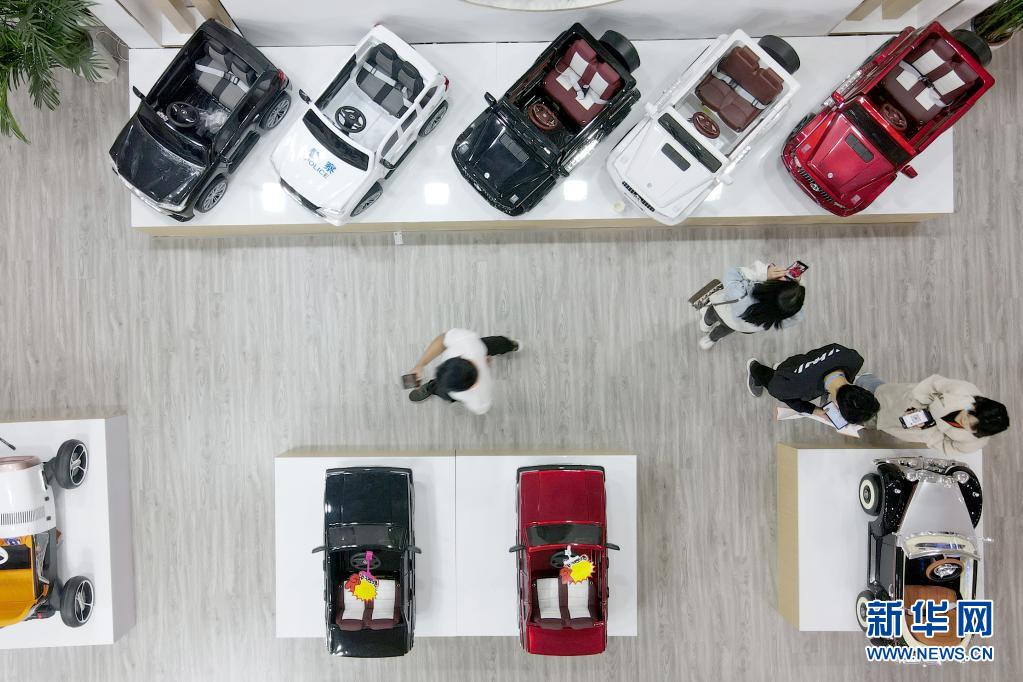 4月17日,客商在博览会上选购童车产品(无人机照片)。