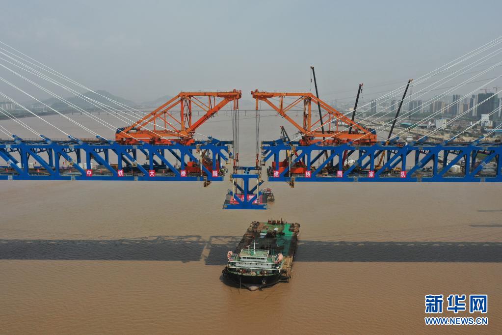 当日,在浙江台州的杭绍台铁路建设施工现场,随着最后一片钢梁吊装完成,杭绍台铁路控制性工程椒江特大桥顺利合龙。