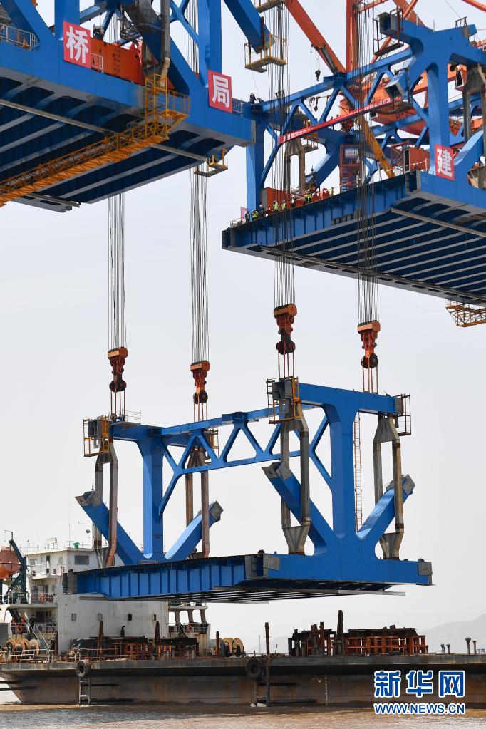 4月17日,施工人员在进行杭绍台铁路椒江特大桥最后一片钢梁的吊装施工。