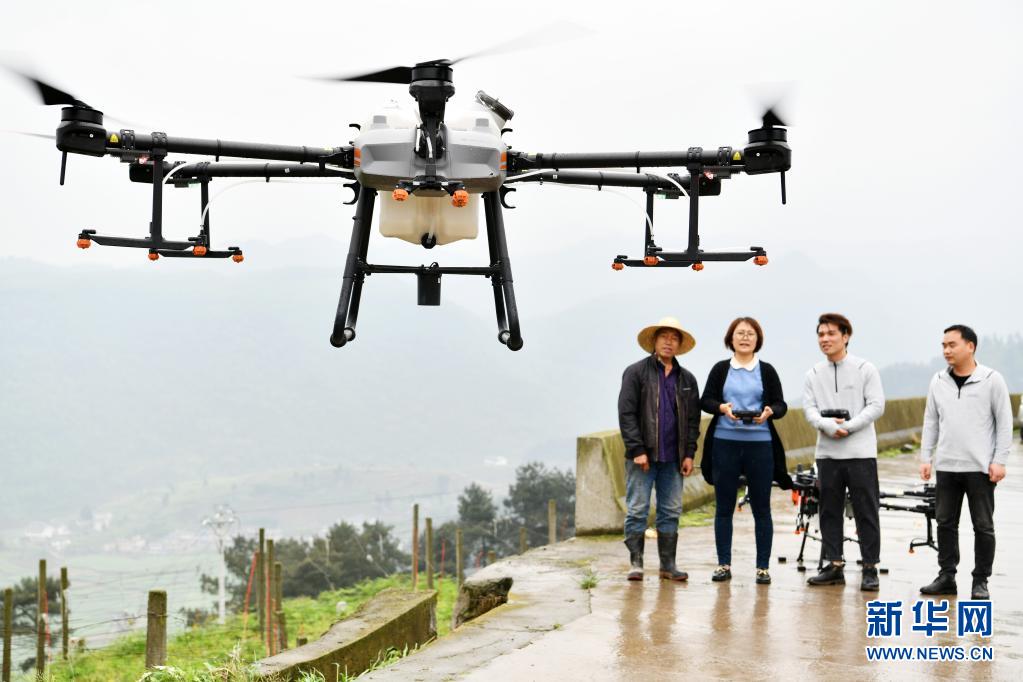 4月17日,在贵州省贵阳市息烽县西山镇鹿窝村,农技人员(左二)向农民介绍植保无人机的结构和植保特点。