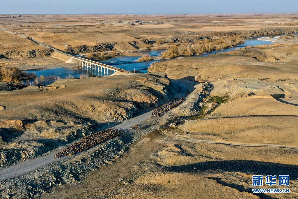 4月17日,新疆福海县牧民赶着牲畜穿过额尔齐斯河,向春秋牧场进发(无人机照片)。