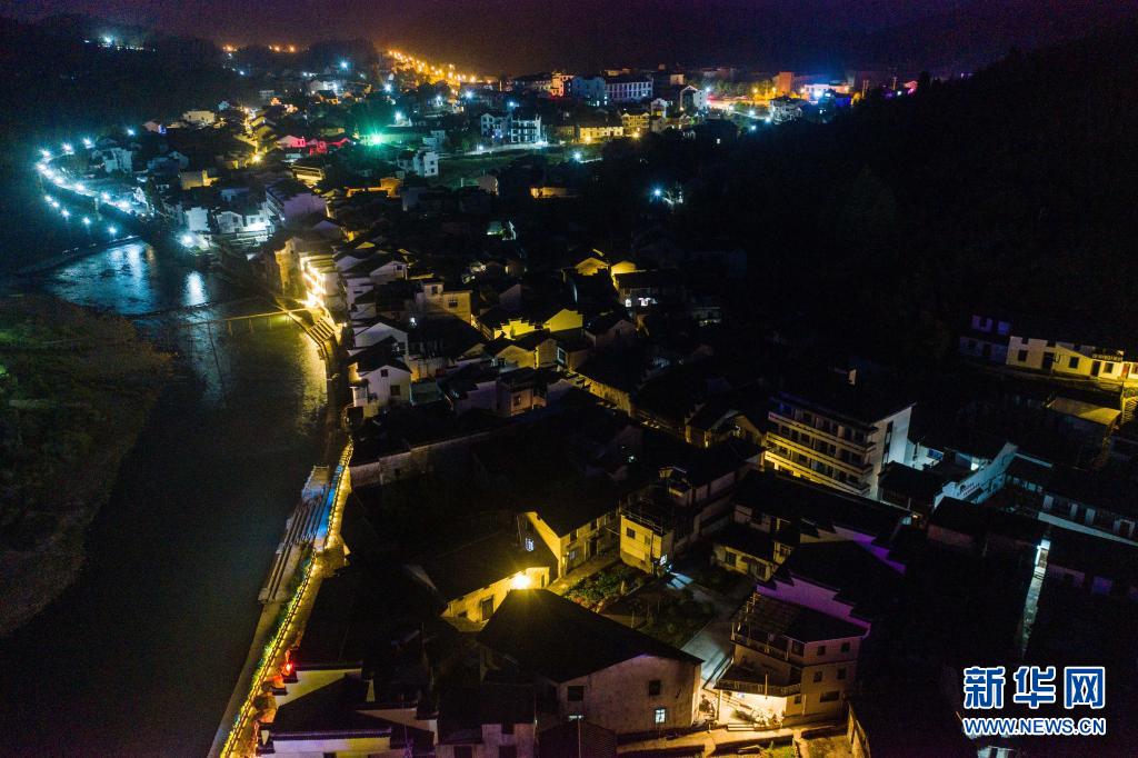 4月17日,杭州市临安区河桥古镇的夜晚灯火阑珊(无人机照片)。