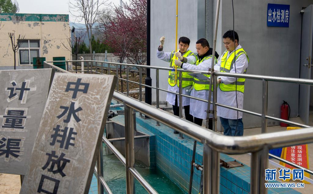 洛南县环境监测站人员在洛南县污水处理厂排放口进行定期采样监测(4月11日摄)。