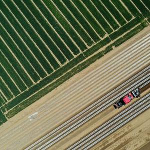 4月18日,滦州市茨榆坨镇杨家坨村农民在播种地膜花生(无人机照片)。