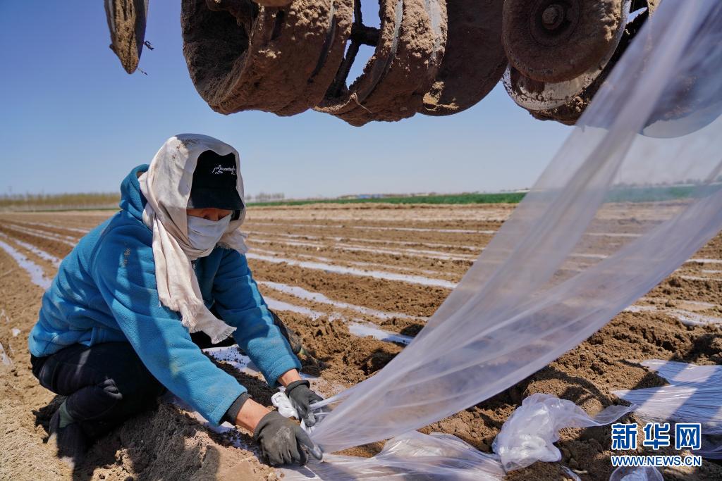 4月18日,滦州市茨榆坨镇杨家坨村农民在整理花生播种所需的地膜。