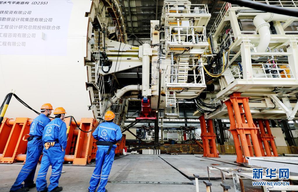 工人们在“骥跃”盾构机推拼同步组件下观察机械运转情况(4月13日摄)。