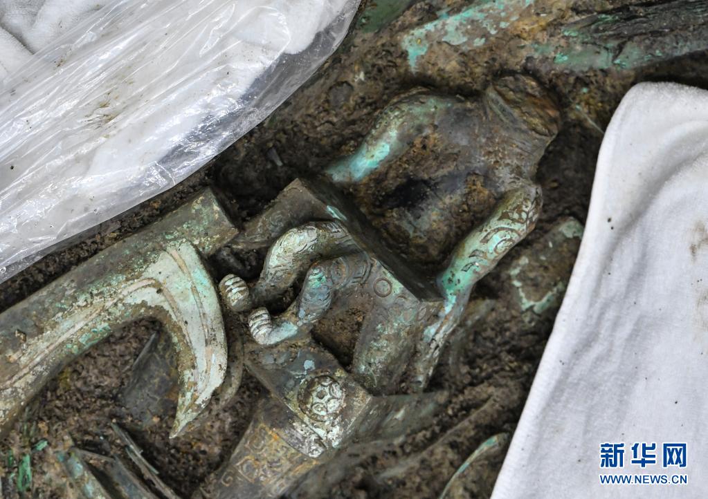 这是在三星堆遗址考古发掘现场3号“祭祀坑”内拍摄的具有人类形象特征的青铜器(3月19日摄)。新华社记者 李贺 摄