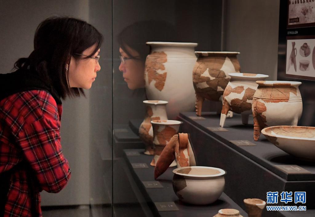 参观者在二里头夏都遗址博物馆内观看展出的陶器(2019年10月19日摄)。新华社记者 李安 摄