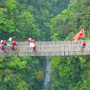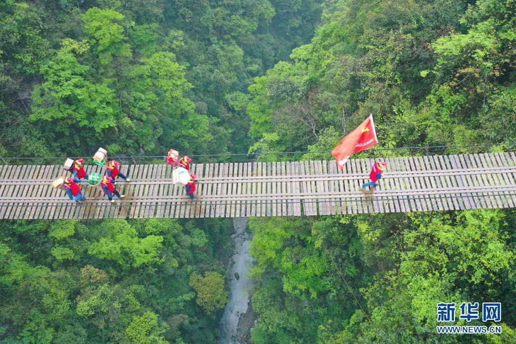 4月14日,壶瓶山供电所的工人们行走在湖南省常德市石门县壶瓶山镇一处峡谷之上的吊桥上(无人机照片)。