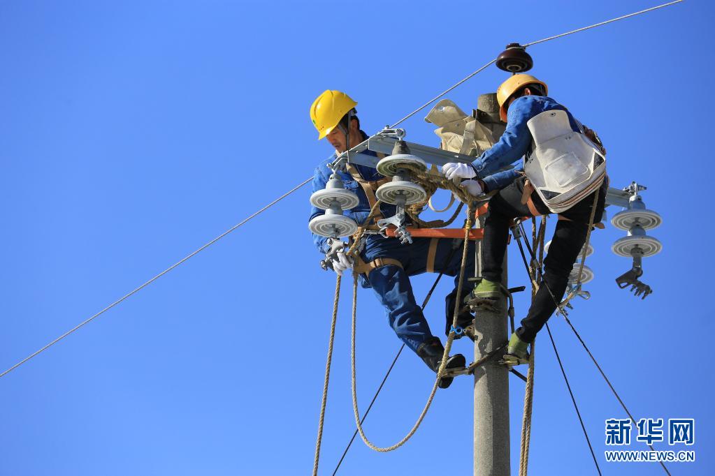 壶瓶山供电所工人周长勇(左)、谭功波在湖南省常德市石门县南北镇白竹山村开展电网改造施工(2018年1月9日摄,资料照片)。