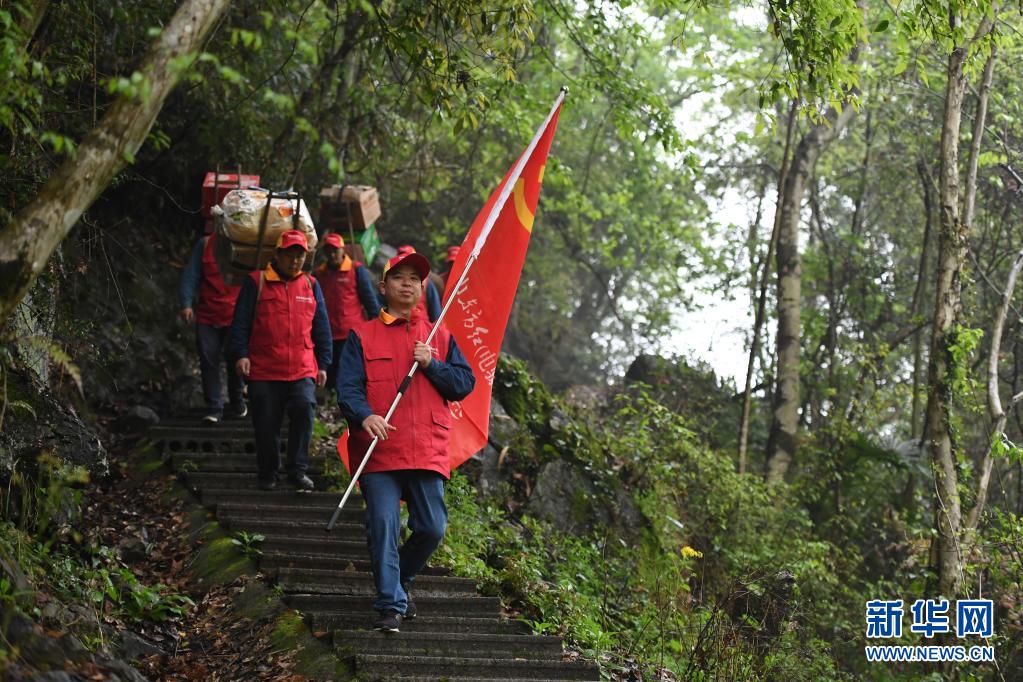 4月14日,壶瓶山供电所的工人们行走在湖南省常德市石门县壶瓶山镇境内。