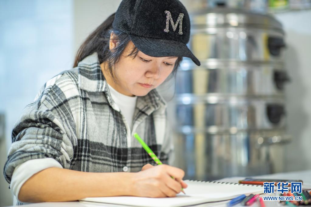 4月13日,欧阳勤芸在位于重庆市渝北区的工作室内为构思创作的造型馒头画设计草图。新华社记者 黄伟 摄
