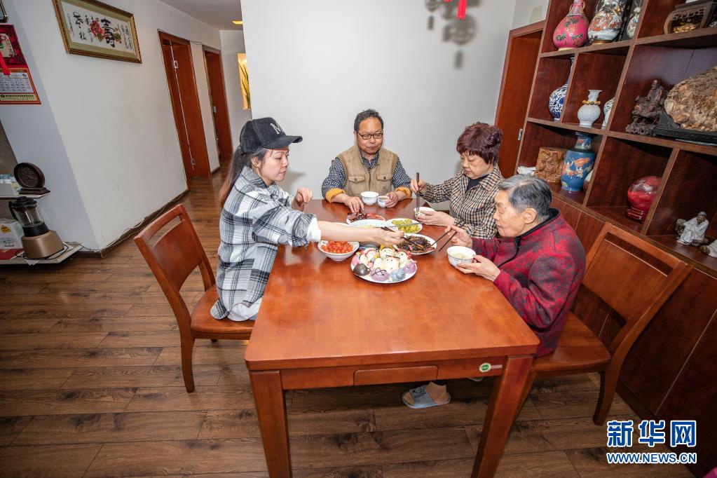 4月15日,欧阳勤芸(左)在位于重庆市渝北区的家中与家人一起吃晚饭。新华社记者 黄伟 摄