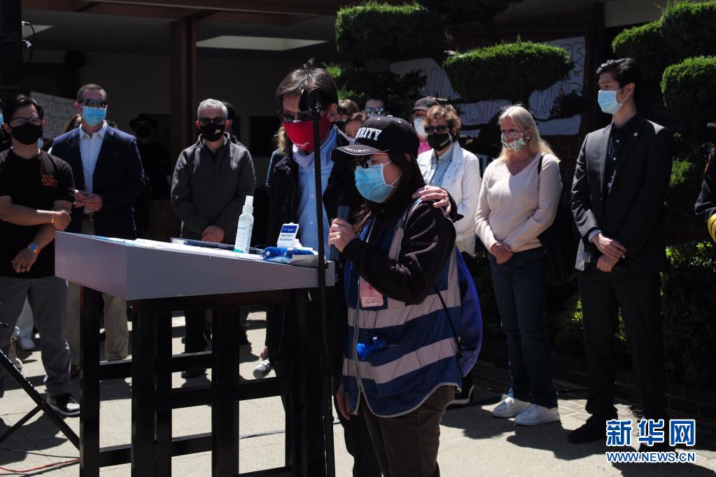 4月17日,受害者(前右)在美国加利福尼亚州米尔布雷参加集会,抗议针对亚裔的歧视行为和仇恨犯罪。