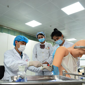 第十批山东省援助喀什地区肺科医院工作队成员吴海良(中)为当地医务工作者进行胸腔穿刺培训(4月17日摄)。
