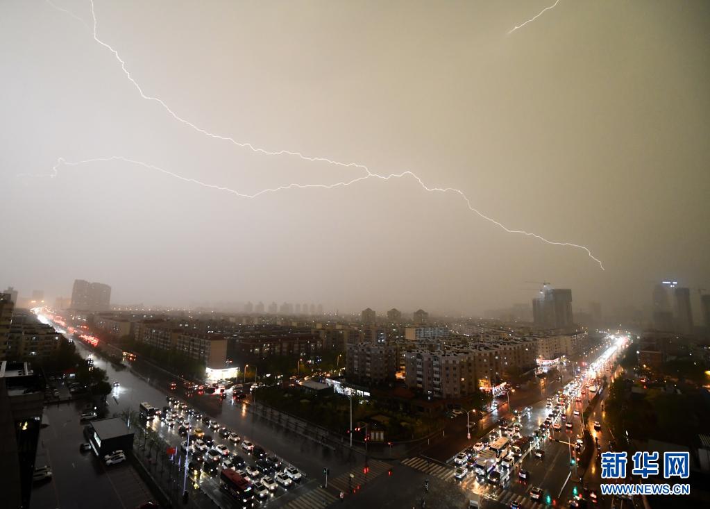 这是4月15日傍晚在天津市南开区一处楼顶拍摄的闪电(长时间曝光照片)。