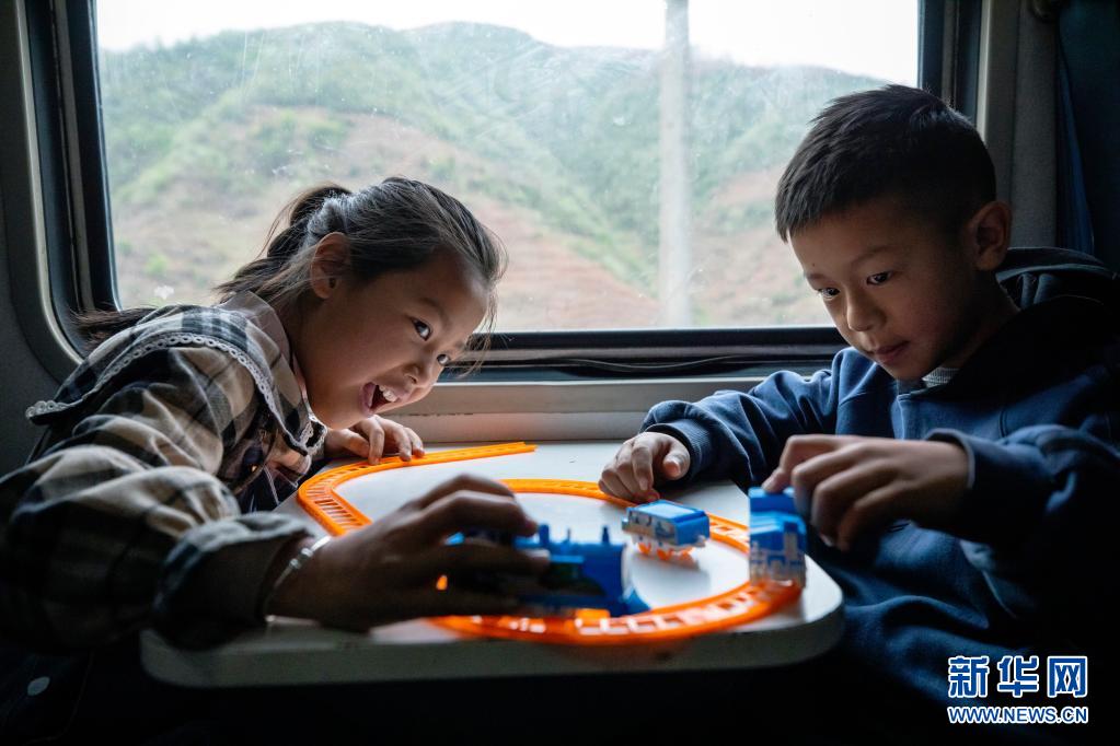 在乘坐5633次列车从家返校途中,喜德县城关小学三年级学生阿尔伍支(左)和弟弟罗泽元在玩火车玩具(4月11日摄)。姐弟俩几乎每个星期都坐这趟火车往返于家和学校之间。
